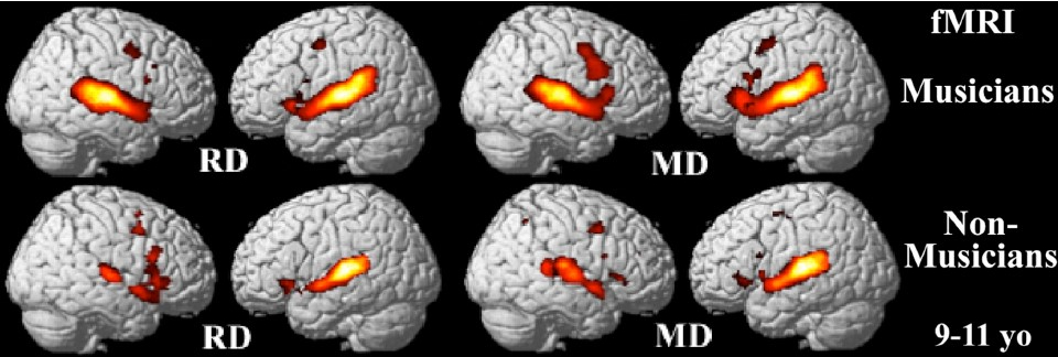 Numerous studies have shown that music education is effective in the development of numerous cognitive domains including intelligence, mathematics, spatial reasoning, reading, writing, and memory[1]. Playing an instrument, or even simply engaging in active listening to music, lights up numerous areas of the brain[2]. One study has shown that after 15 months of learning an instrument, there are even structural changes in both motor and auditory areas of the brain[3]. The brain scan below contrasts the areas that light up in the brain, showing increased activity, of non-musician and musician 9-11 year-olds on simple rhythmic (RD) and melodic discrimination (MD) tasks. It is clear that musicians have more brain activity while doing these tasks[7].